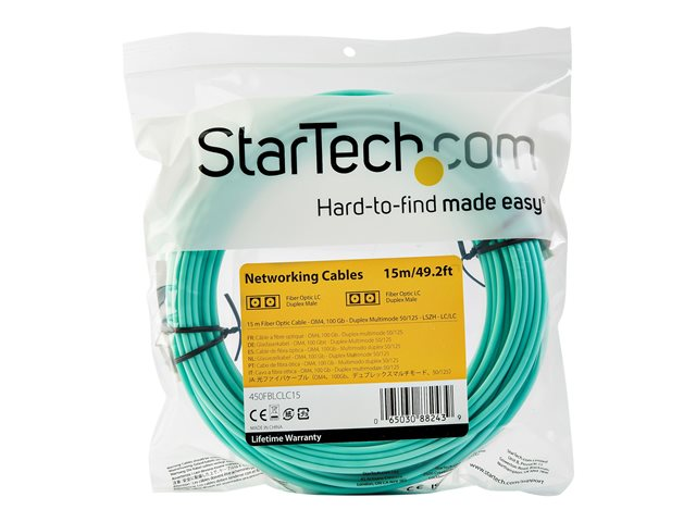StarTech.com 15 m OM4 LC to LC Multimode Duplex Fiber Optic Patch Cable- Aqua - 50/125 - Fiber Optic Cable - 40/100Gb - LSZH (450FBLCLC15) - Cordon de raccordement - LC multi-mode (M) pour LC multi-mode (M) - 15 m - fibre optique - duplex - 50 / 125 microns - OM4 - turquoise