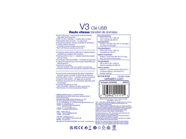 Dotée d'une interface USB 3.0 pour le transfert de données SuperSpeed, la clé USB Store 'n' Go V3 est beaucoup plus rapide qu'une interface USB 2.0, permettant ainsi d'augmenter la vitesse de transfert et d'enregistrer des fichiers plus volumineux de n'importe quel type.