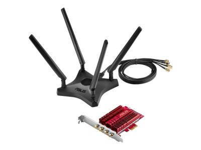 Le ASUS PCE-AC88 est un adaptateur Wi-Fi AC3100 double bande 4 x 4 PCI Express (PCIe) pour les PC de bureau. Sa technologie NitroQAM fournit un débit combiné de 2100 Mb/s sur la bande 5 GHz et 1000 Mb/s sur la bande 2,4 GHz, soit 60 % plus rapide que les adaptateurs 3 x 3, assurant la fluidité de vos streamings et des jeux en ligne sans latence. Il améliore aussi votre réception Wi-Fi et, couplé à un routeur 4 x 4, il vous fournit tout le potentiel du Wi-Fi 4 x 4.